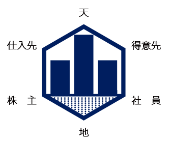 ![]() 各頂点は「天と地」、「仕入先と得意先」、「株主と社員」を表し 大地の恵みを受け、仕入先・得意先の御引立てを頂いて 株主・社員の協力のもとに会社を維持発展させていき、 全てが均衡のとれた拡大をすることで、 常に正六角形を保ちながら発展する という経営理念を表しています。 |